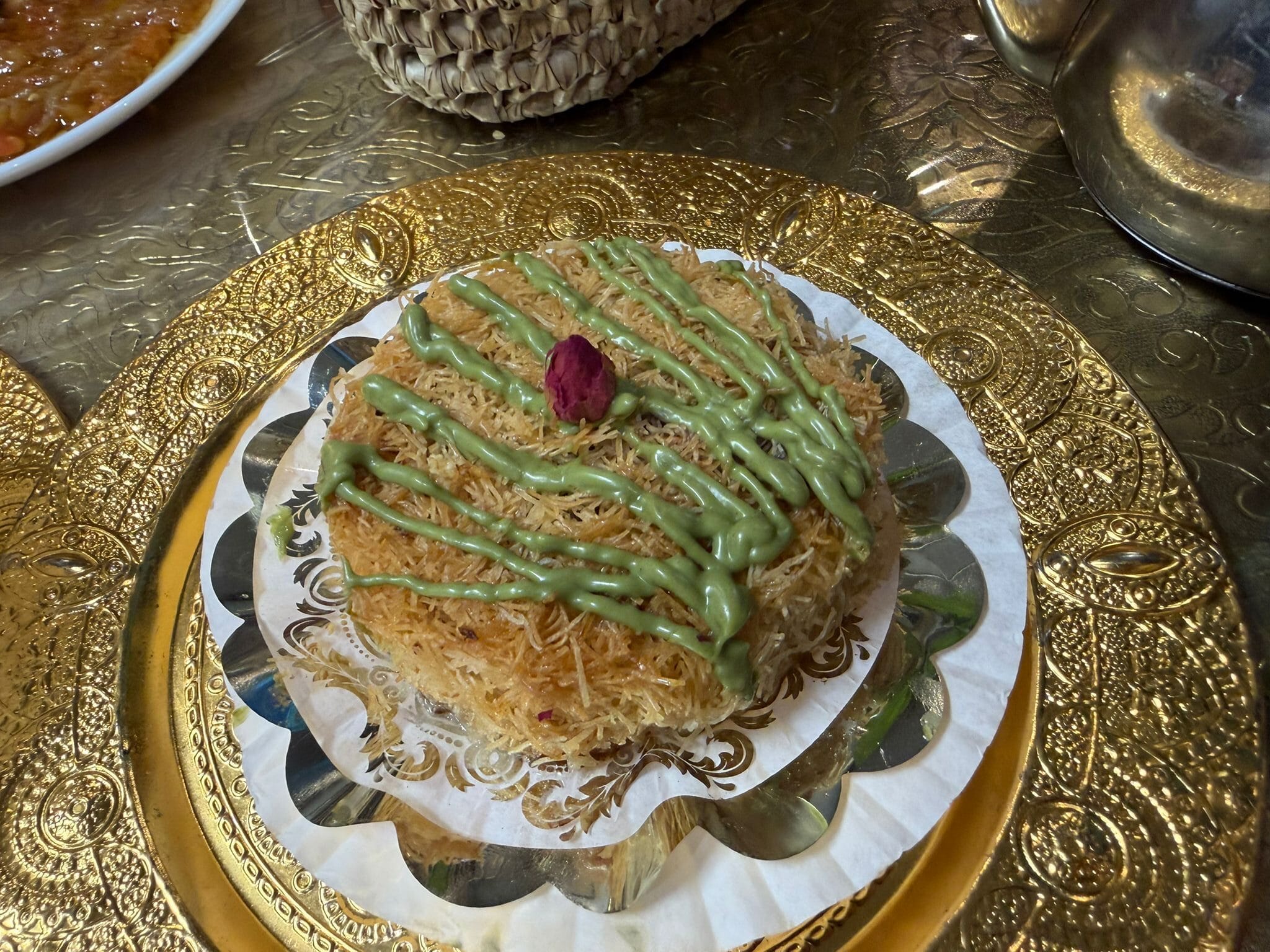 Le Knefe au coulis de pistache est un gâteau de cheveux d’ange (kadaïf) croustillants fourré au fromage fondant, le tout nappé d’une crème ou d’un coulis intense à la pistache.